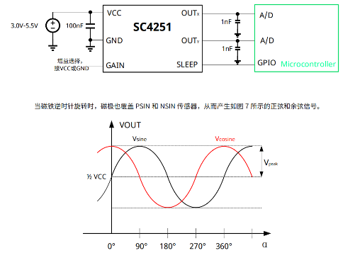 SC4251 is an integrated Hall effect position sensor designed to scan permanent magnets. When the magnet rotates, the IC outputs sine and cosine analog signals, enabling calculation of the permanent magnet’s current position. Equipped with a gain configuration pin, the SC4251 allows adjustment of output amplitude via external voltage levels (high/low). The chip supports a Sleep Mode with μA-level power consumption, making it suitable for battery-powered applications.