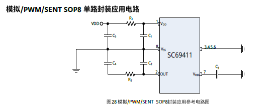 可选输出模式:模拟输出,脉宽调制 PWM 输出,符合 SAE J2716 标准的 SENT 输出,以及 2线电流型 PSI5(V2.3)输出